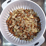2. While the squash is cooking, heat a non-stick frying pan over medium heat. Then add the buffalo meat and mix in the onions. Cook for about 10 minutes until the meat is browned. Then drain the fat from the pan.