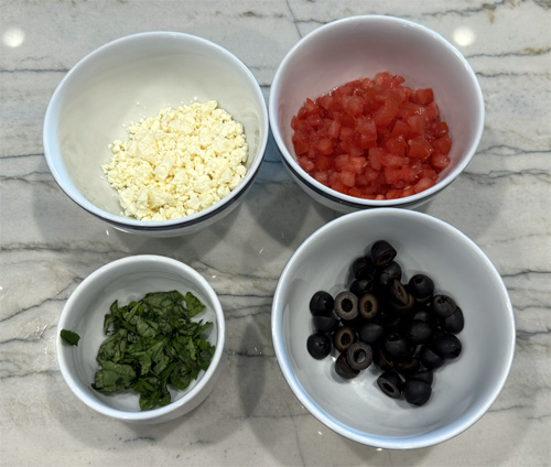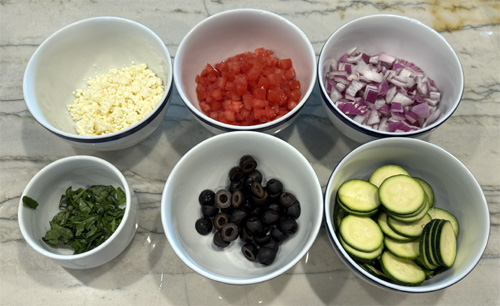 1. Prep the ingredients and set them aside. Slice the zucchini, chop the onion and tomatoes, cut the olives and mince the basil.
