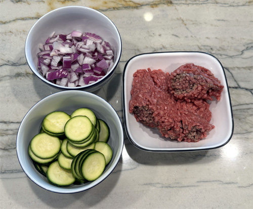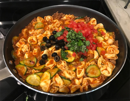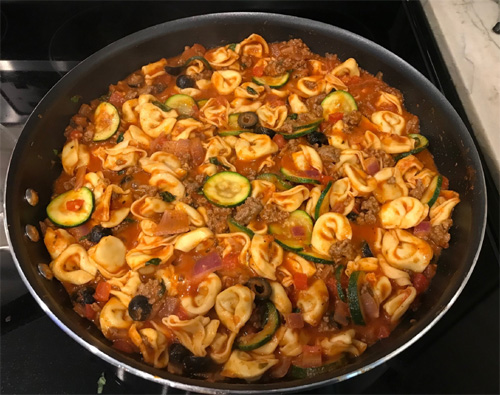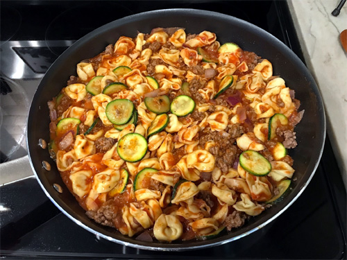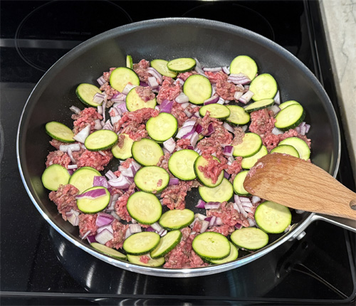 3. While the tortellini is cooking, heat a large skillet over medium heat. Once it's hot, lightly coat it with olive oil spray, then add the ground beef, zucchini, and onions. Keep turning and breaking the meat apart until it's browned and no longer pink.