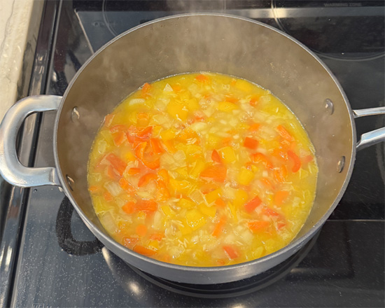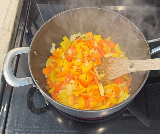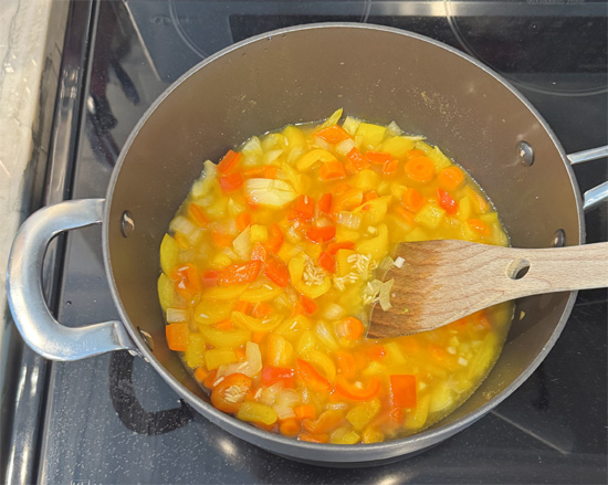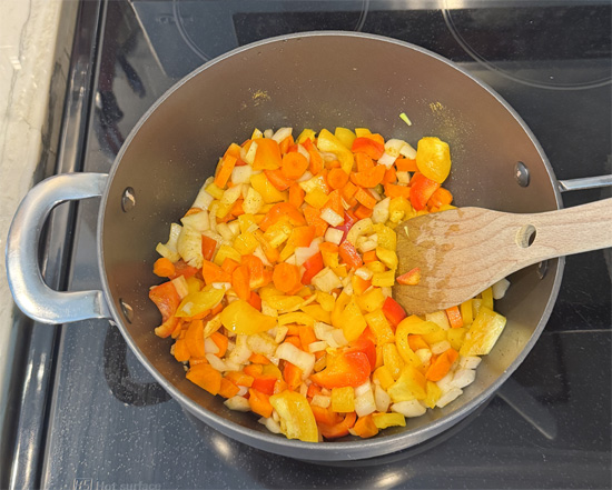 3. Sauté Vegetables: In a pot, heat the olive oil over medium heat. Add the bell peppers, carrots and onions. Sauté for about 5 minutes until slightly tender.