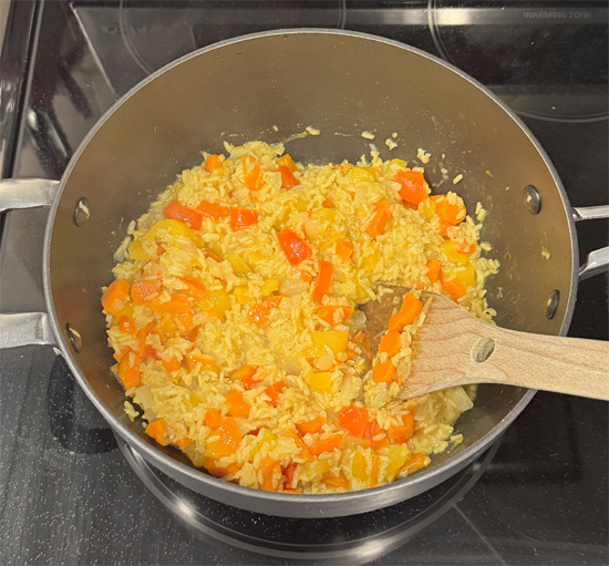 5. Simmer: Reduce heat to low, cover, and simmer for about 40-45 minutes, or until the rice is cooked and the liquid is absorbed. (If some liquid remains, you can turn up the heat to medium and stir while the extra boils off.)