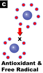 To prevent this, it's antioxidants to the rescue! In picture C you'll notice the antioxidant has electrons just like free radicals, but those electrons don't have to be balanced. When a free radical rushes around the body looking for a spare electron, the antioxidant can give one up and then easily "rebalance" itself with what's left. The free radical is neutralized while cells and DNA are protected.